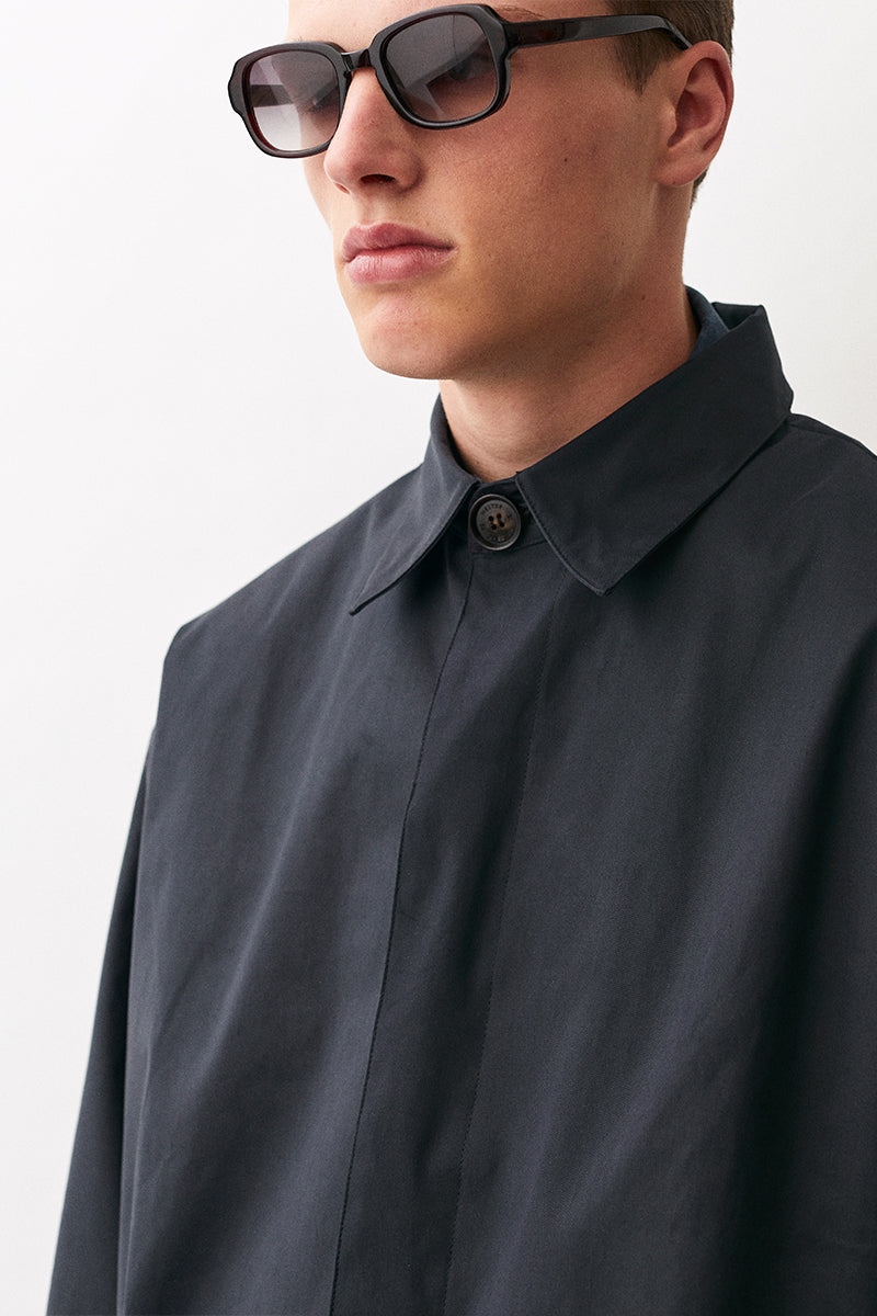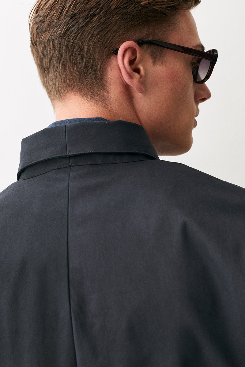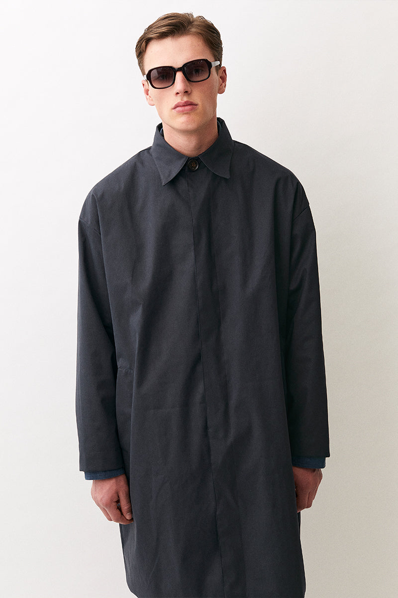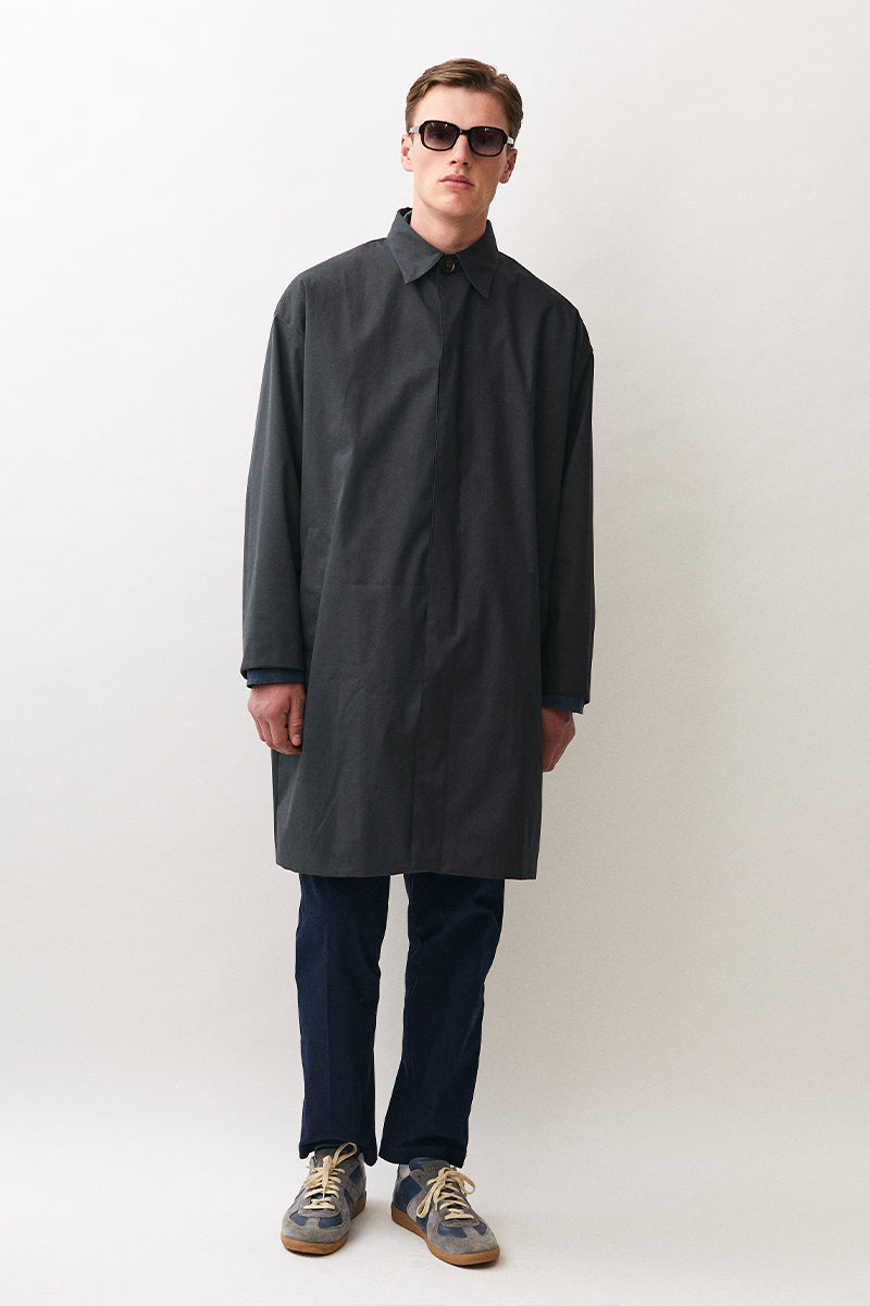 Oversized trenchcoat made from the twill cotton look material. Lightweight dry shell with high waterproofness and breathablility. The fit is generous with dropped shoulders and wide arms with darts to accentuate the curves. The jacket is also equipped with horn logo buttons closure and lined with a soft yellow lining.