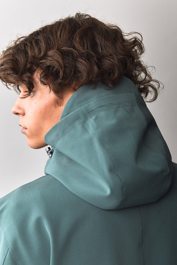 Our Parka style which has become infamous for its absolutely good fit and minimalistic look: a classic, minimalistic exterior with full functionality underneath. The exterior is made of a waterproof high performance fabric. A wide choice of high performance fabrics like this nina spina fabric. Featured with a beautiful, removable liner in contrasting colours. This Nina Spina fabric is a type of serge structured fabric. Serge means the weaving in itself is already so tight it already gives water repellent and windproof properties. Its a durable and firm fabric often used for military purposes and suiting. Typically you see a diagonal rib weave from left to right going up. We enhanced this fabric by bonding and laminating the backside for absolute waterproofness and breathability. The outer serge fabric is on top of this treated with a DWR coating for extra water-reppellency. Basically we created an almost indestructable cloth that will last for years.